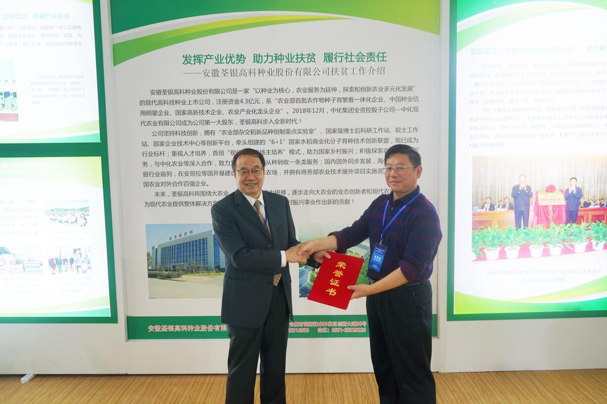 ??? 打好脫貧攻堅戰(zhàn)是黨的十九大提出的三大攻堅戰(zhàn)之一,對如期全面建成小康社會、實現(xiàn)我們黨第一個百年奮斗目標(biāo)具有十分重要的意義。習(xí)近平總書記多次強調(diào),要動員全社會力量廣泛參與扶貧事業(yè),鼓勵支持各類企業(yè)、社會組織、個人參與脫貧攻堅。荃銀高科自成立以來,堅持以發(fā)展民族種業(yè)為己任,在做強做大企業(yè)的同時,積極發(fā)揮產(chǎn)業(yè)優(yōu)勢,助力種業(yè)扶貧,履行社會責(zé)任,取得積極成效。為表彰荃銀高科在扶貧工作中的突出表現(xiàn),中國種子協(xié)會為公司頒發(fā)榮譽證書。